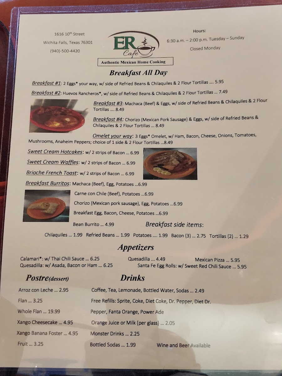 Welcome to ER Cafe, a charming culinary haven located at 1616 10th St, Wichita Falls, TX. Renowned for its all-day breakfast, the menu features delightful options like the Breakfast #1 with two eggs, refried beans, and chilaquiles for just $6.45, and sweet treats such as Sweet Cream Hot Cakes and Waffles priced at $7.95. Highlighting its diverse offerings, ER Cafe also presents appetizing starters like Calamari and hearty burritos, ensuring a satisfying meal for every taste.